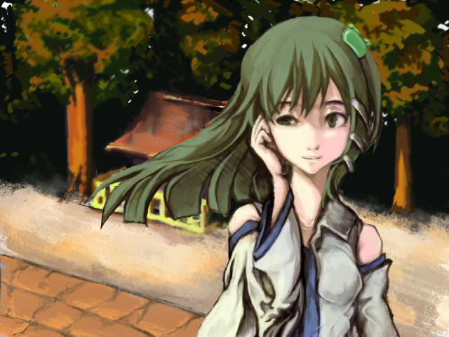 1girlbare shouldersdetached sleevesfemale focusfloating hairforestfrog hair ornamentgreen eyesgreen hairhair ornamenthand in own hairmatching hair/eyesnatureoutdoorsplantsceneryshrinesnake hair ornamentsolotreeupper bodywind