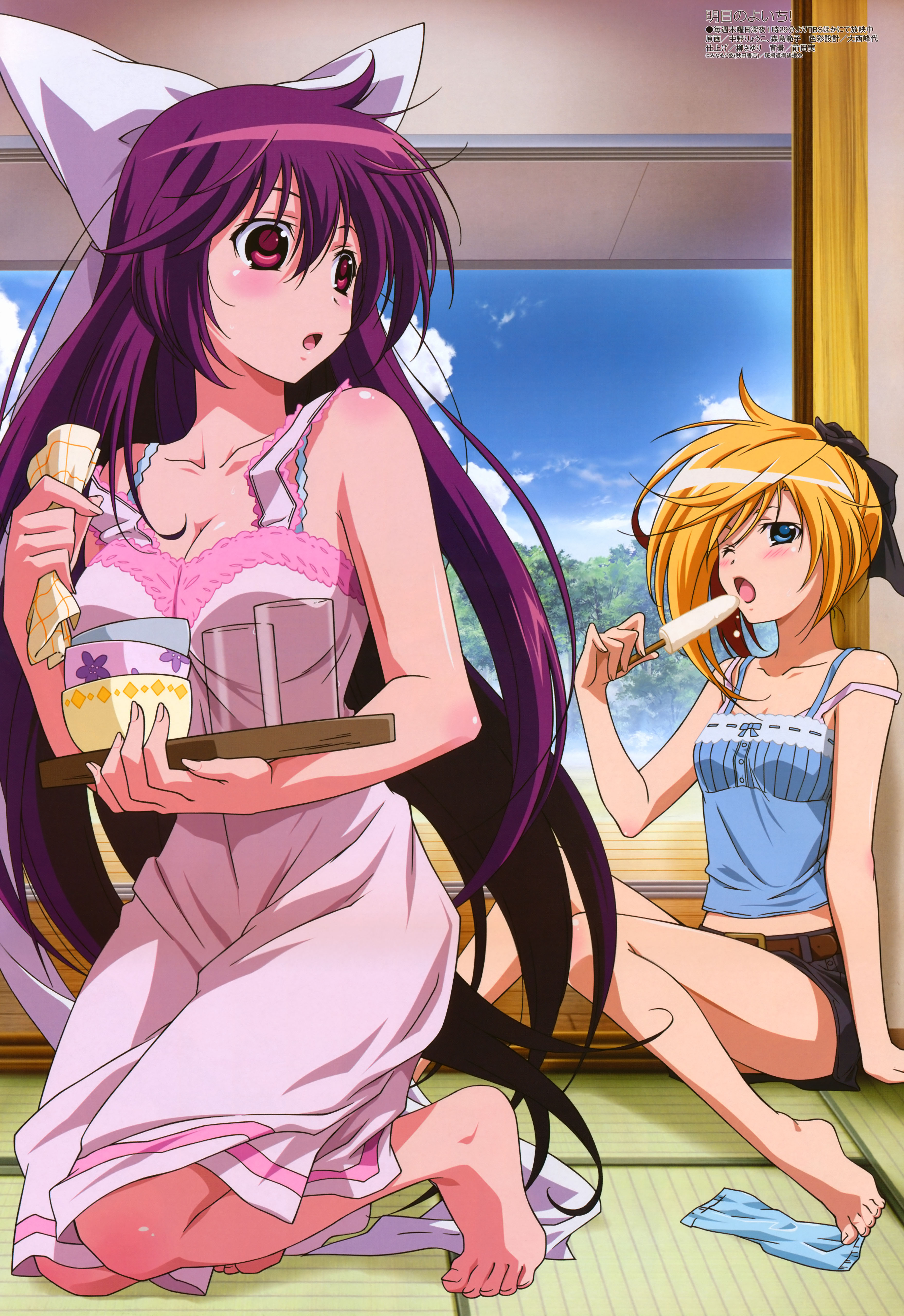 00s2girlsapronbare shouldersbarefootbeltblonde hairblue eyesblushbowbowlbreastscamisolecleavagecollarbonecupfeetfoodhair bowice creamlong hairmidriffmultiple girlsone eye closedopen mouthpopsiclepurple eyespurple hairshortsstrap sliptatamitoestrayvery long hairwink
