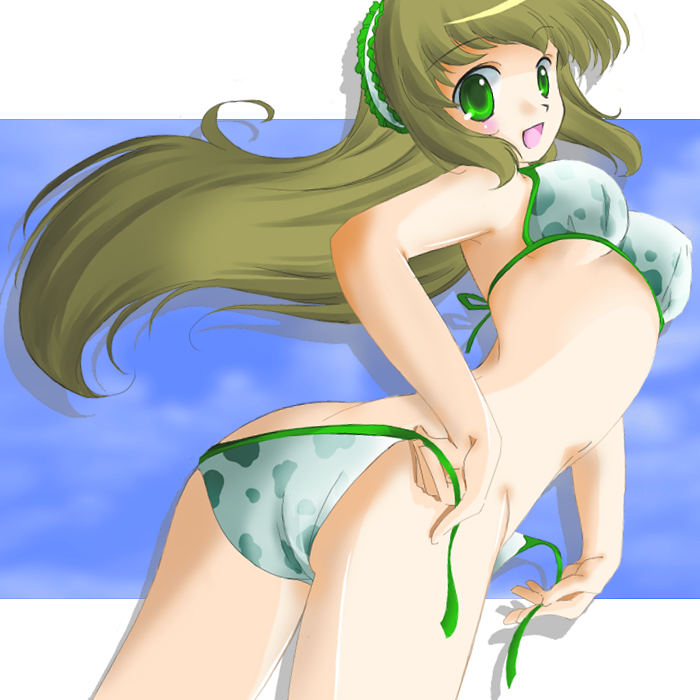 1girlanimal printassbikinibrown haircow printfemale focusgreen eyeslong hairlooking backsoloswimsuit