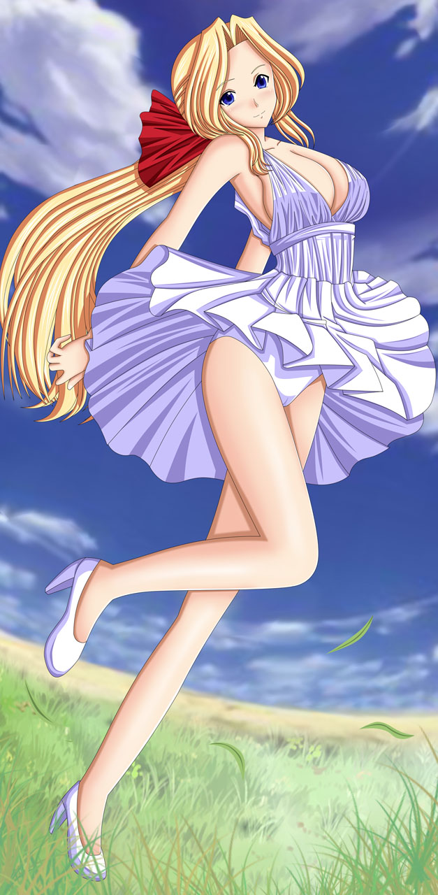blonde hairblue eyescleavagefemalefemale onlyFlag for Deletionhumanlong hairpantiesskirt liftsolosundresswhite panties