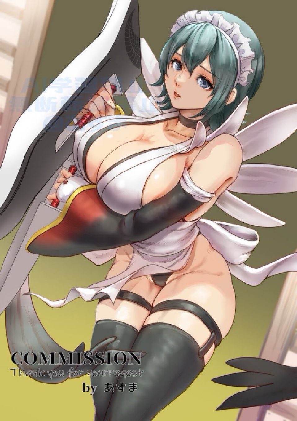 1girlartist nameblack hairbreastscleavagecollarbonefemale focusfingerless glovesgloveslarge breastslooking at viewermaidmaid headdressmayomakadaysopen mouthsolothighs