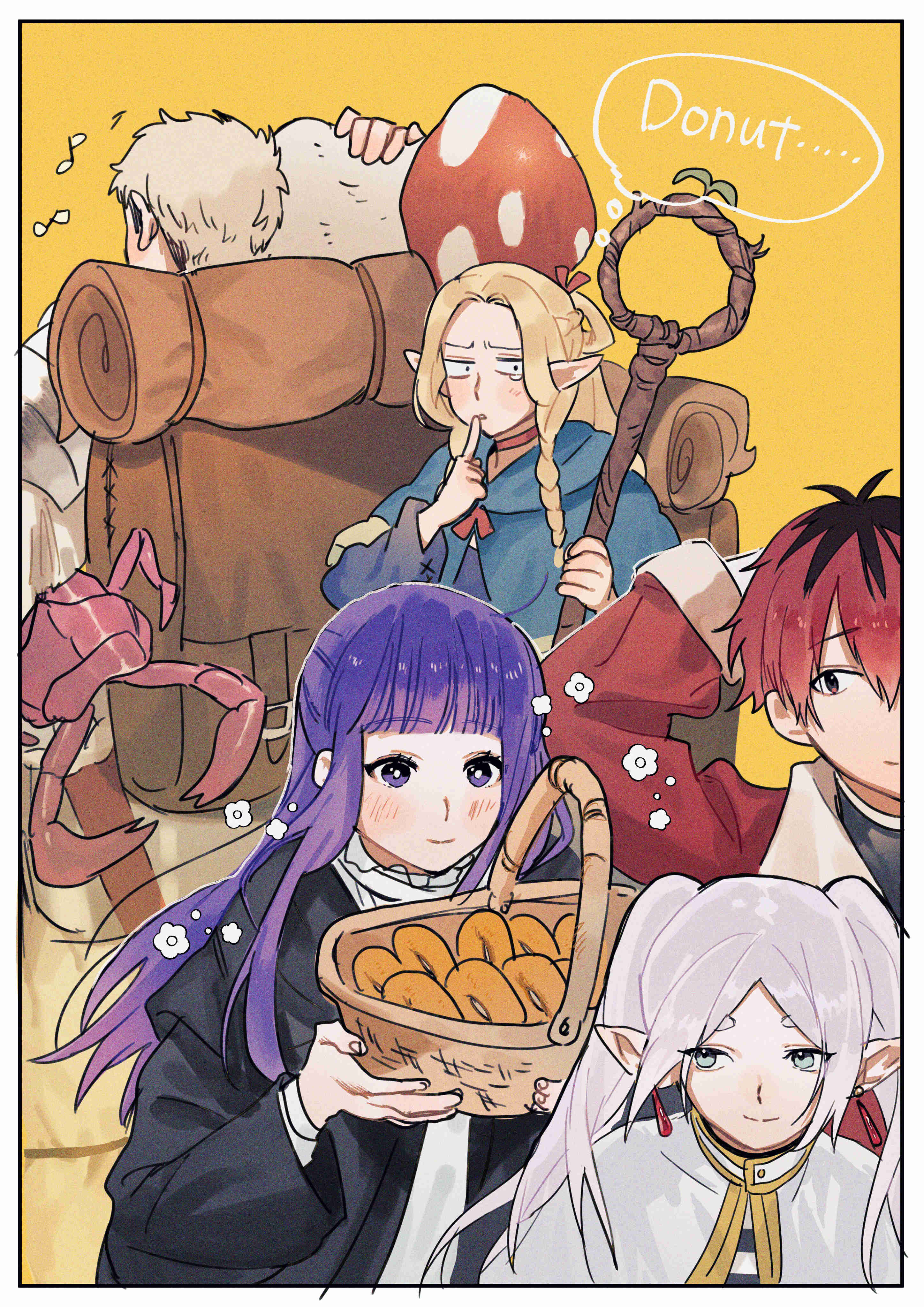 2boys3girlsarmorbackpackbagbasketblonde hairblue capeletblunt bangsblushborderbright pupilscapeletcrabcrossoverdonutenglish textfoodgrey eyesgrey hairholdingholding basketholding staffmultiple boysmultiple girlsmusical notepointy earsponytailpurple eyespurple hairred eyessakurappusmilespeech bubblestaffthought bubbletwintailswhite borderwhite pupilsyellow background