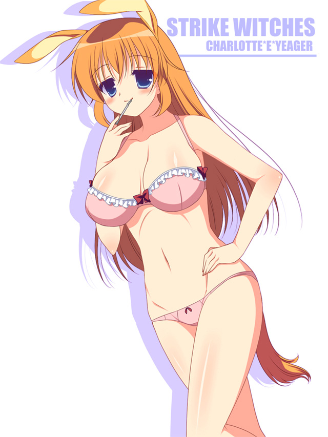 00s1girlanimal earsblue eyesblushbrabreastscleavagefemale focushand on own hiphip focuslarge breastslingerielong hairorange hairpantiespink brapink pantiesrabbit earsrabbit girlsmilesolostandingtailunderwearunderwear only