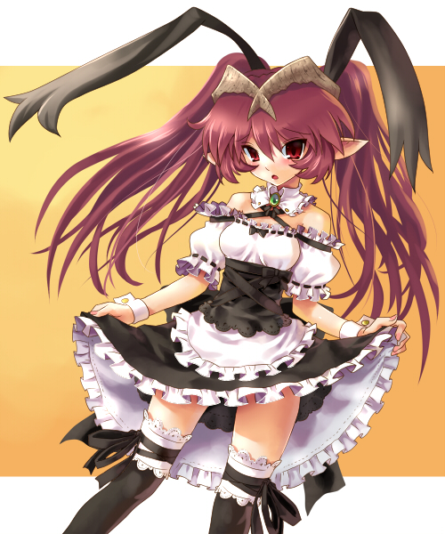 1girlanimal earsblack thighhighsblushclothes liftdressdress liftfemale focusfrilled thighhighsfrillslingeriemaidpetticoatred eyesred hairshort twintailssolothighhighstwintailsunderwear