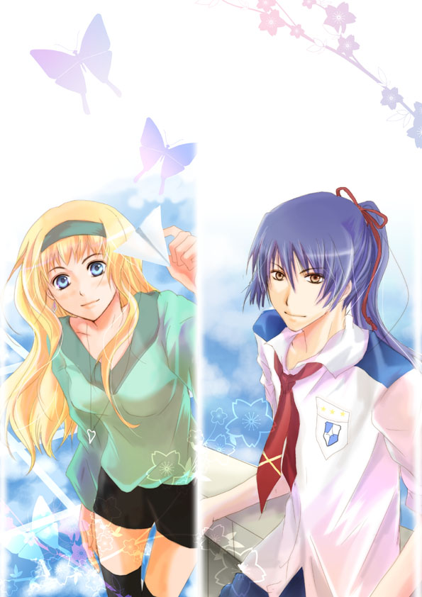 00s1boy1girlblack skirtblonde hairblue eyescollarbonedress shirtholdingholding paper airplanelong sleevesminiskirtnecktiepaper airplaneponytailred necktieschool uniformshirtsimple backgroundskirtstandingsweaterthighhighsupper bodywavy hairwhite backgroundzettai ryouiki