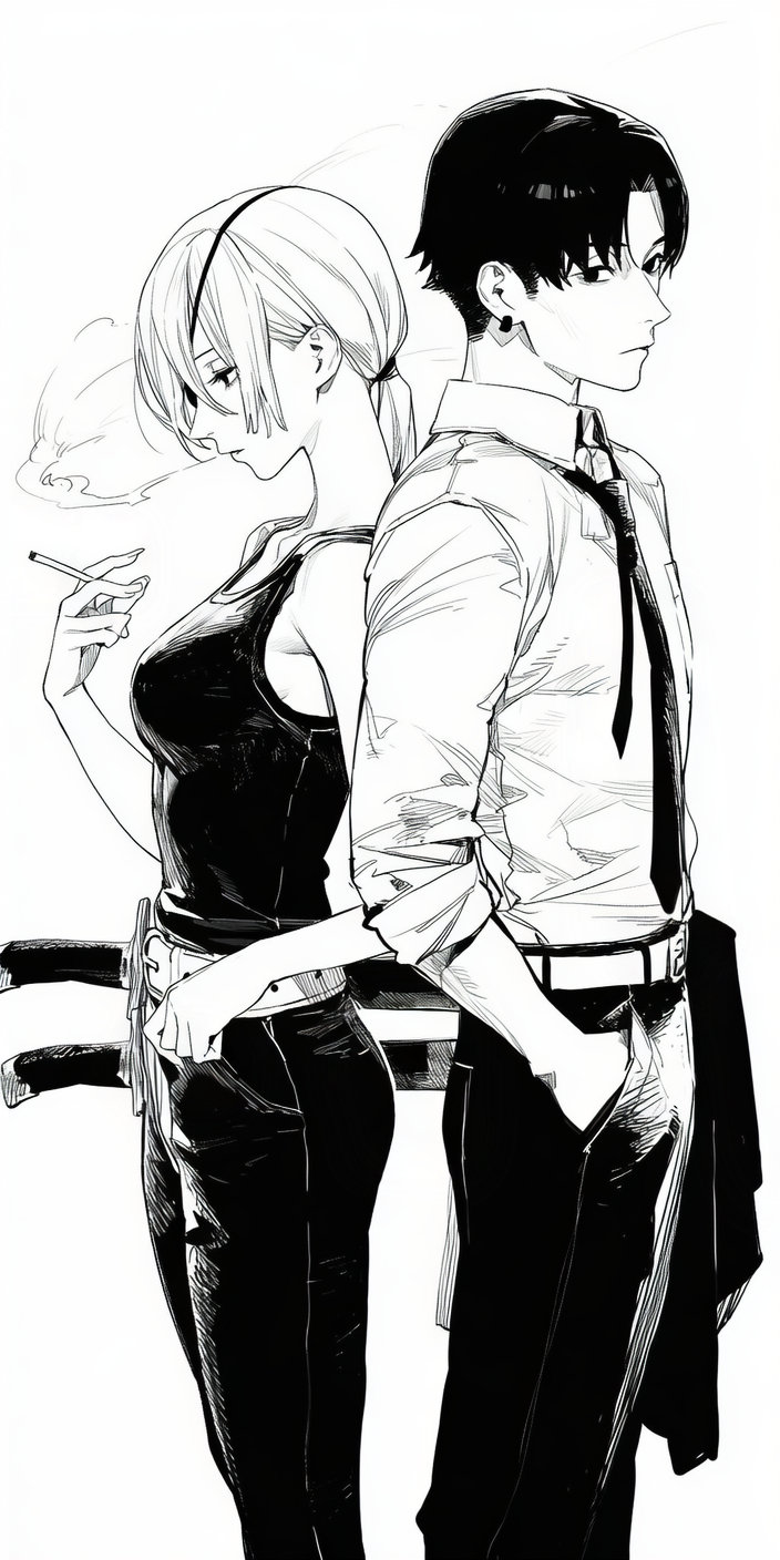 1boy1girlback-to-backbare armsbare shouldersbeltblack hairblack necktieblack pantsblack tank topbreastscigarettecollared shirtcowboy shotearringseyepatchhair between eyeshair tiehand in pocketholdingholding cigarettejewelrylong hairlow ponytailmedium breastsnecktiepantsparted bangsponytailshirtshort hairsleeves rolled upsmokesmokingtank topwhite backgroundwhite beltwhite shirt