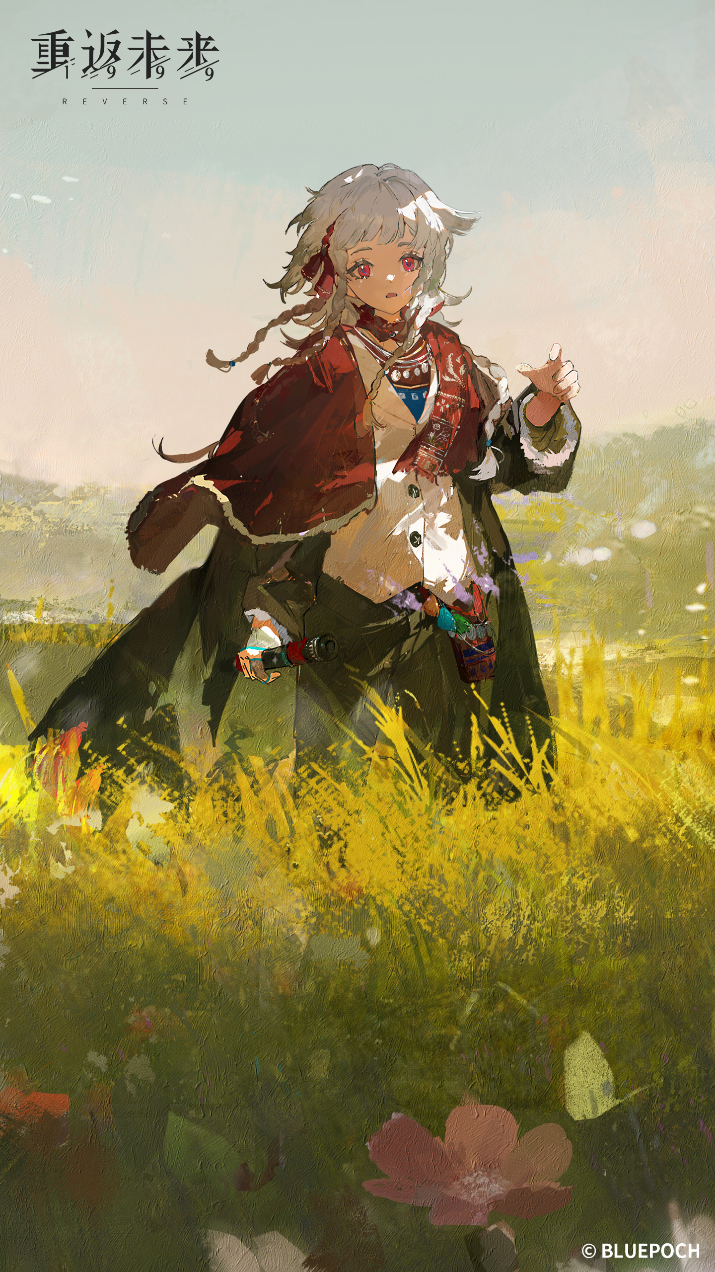 :o1girlblack coatblack pantsblue skycloakcoatcopyright namecopyright noticedayflowerflutegrasshand upholdingholding fluteholding instrumentinstrumentjacketlogolooking at viewermedium hairoutdoorspantspink flowerquad braidsred cloakred eyesskysolostandingwhite hairwhite jacket
