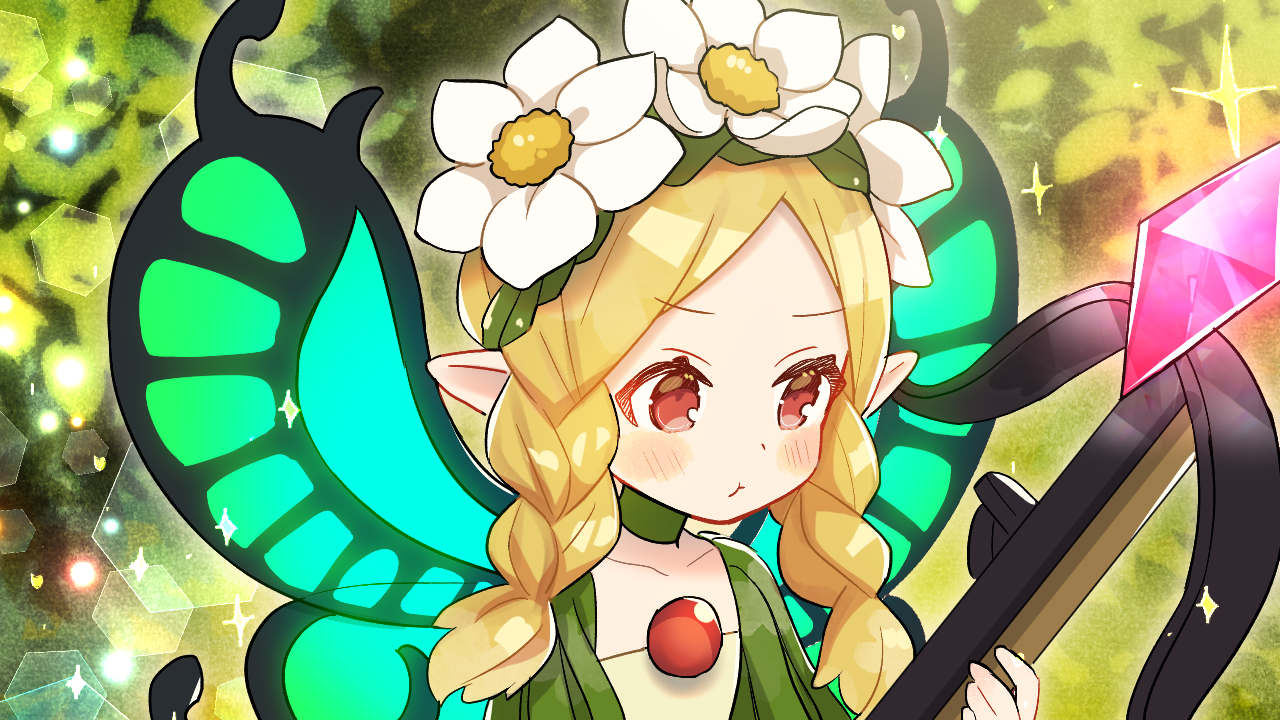 :t1girlblonde hairblushbraidbutterfly wingsclosed mouthflowerhair flowerhair ornamentholdingholding staffinsect wingslong hairparted bangspointy earsportraitsolostafftwin braidswhite flowerwings