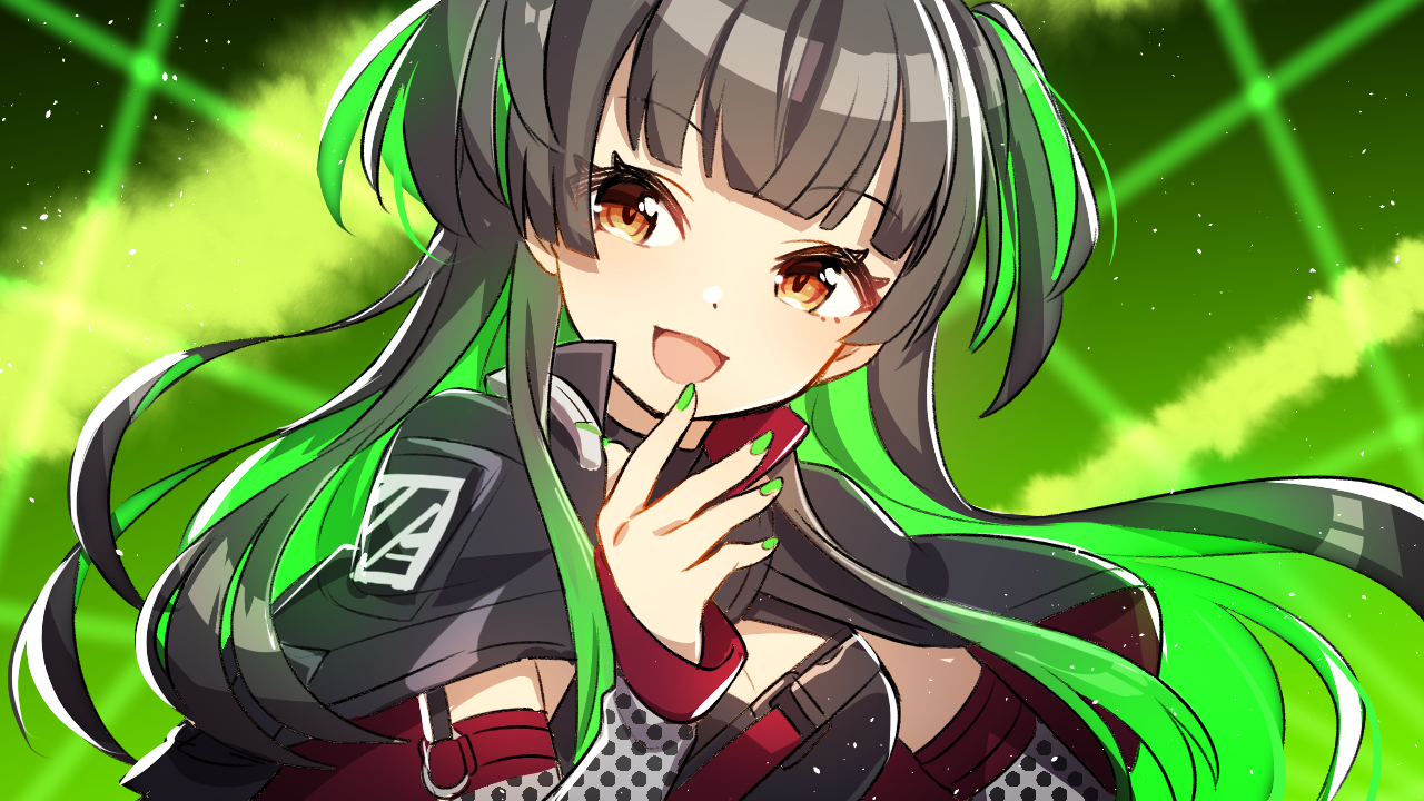 :d1girlblack hairblunt bangsdetached sleevesgreen backgroundgreen nailsgrey sleeveshand uplong hairlong sleeveslooking at viewernail polishneonlight romancer (idolmaster)open mouthpolka dot sleevesportraitred eyessmilesolotwo side up