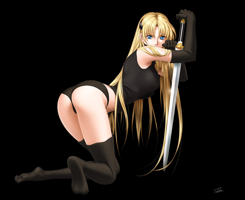 1girlassblonde hairblue eyescrescentcrescent hair ornamentfeetfemale focushair ornamentheadbandlong hairpantiessoloswordthighhighsunderwearvery long hairweapon