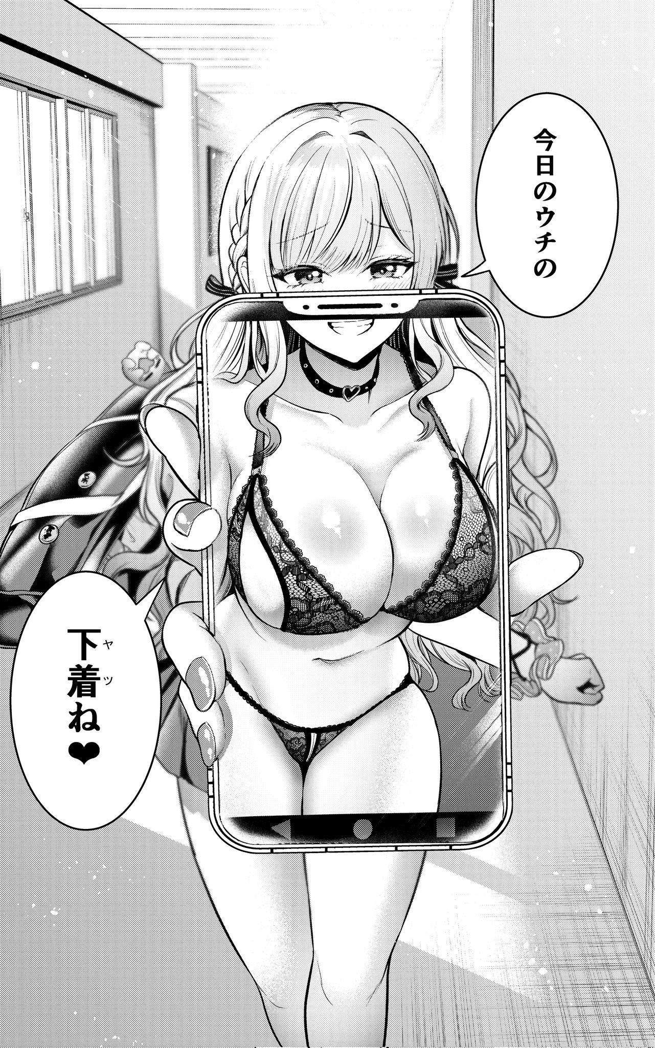 1girlbrabraidbreastscellphonechokercleavageclothing cutoutcollarbonegreyscalegyaruholdingholding phonejapanese textlarge breastslooking at viewermonochromenavelpantiesphonescrunchiesmilespeech bubblestomachteeththighsunderwearwrist scrunchie