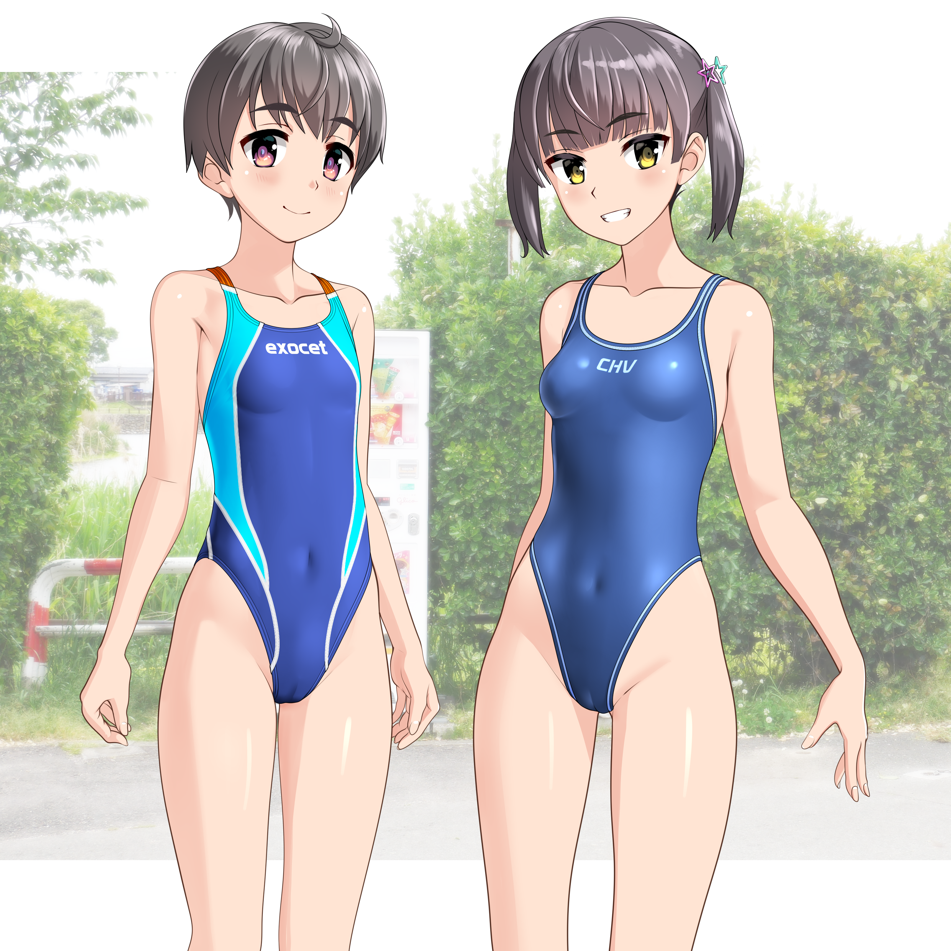 2girlsblack hairblue one-piece swimsuitbreastsbushcameltoeclothes writingcollarbonecompetition swimsuitcovered navelgrinhighleghighleg one-piece swimsuitmulticolored swimsuitmultiple girlsone-piece swimsuitshort hairsmall breastssmilestandingswimsuitthick eyebrowstwintails