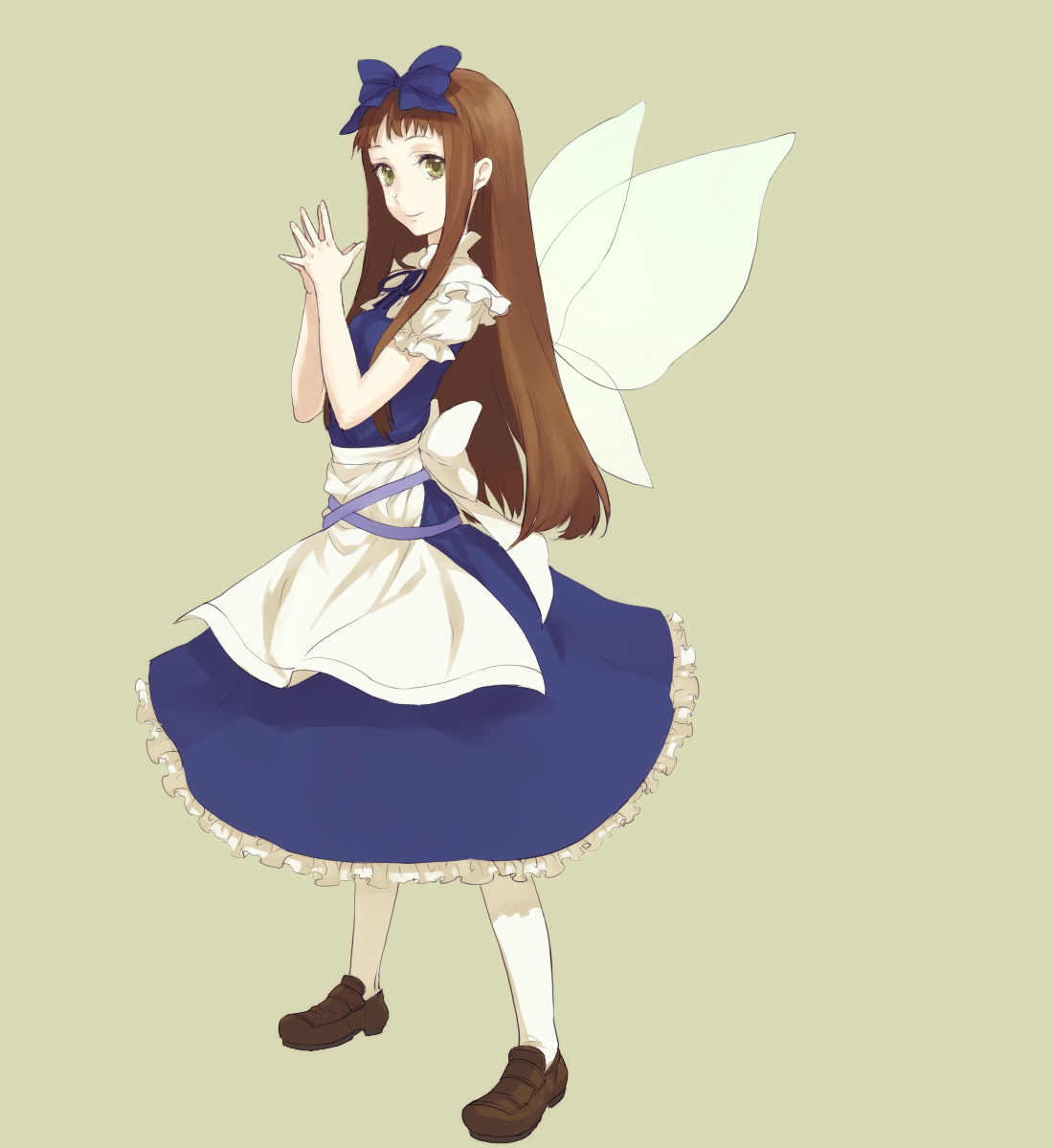 1girlbowbrown eyesbrown hairfemale focusfull bodyhair bowlight smileloaferslong hairshoessimple backgroundsolostandingsteepled fingerswings