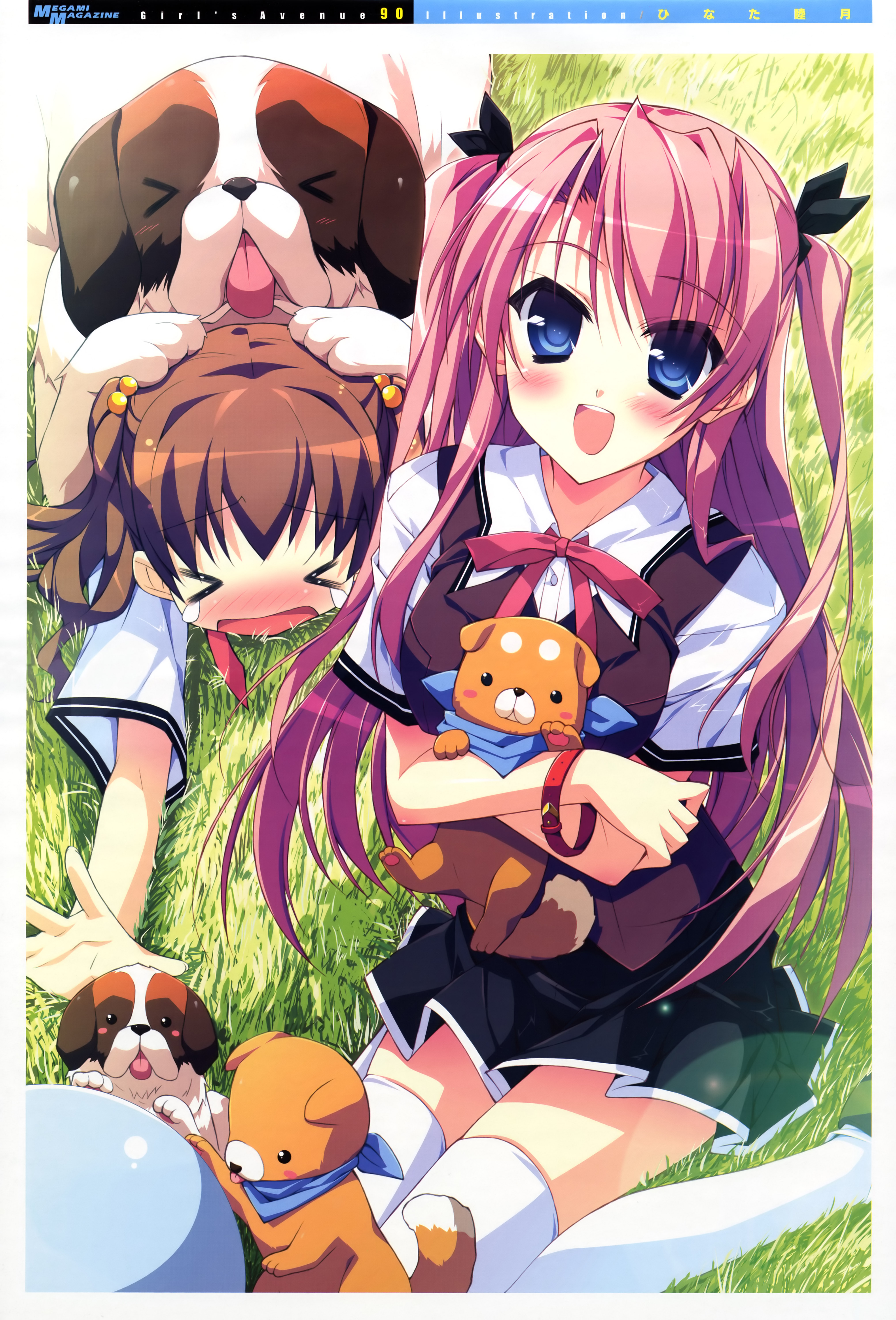 kagiyama hina, mizuhashi parsee, touhou, 2girls, arm warmers, blonde hair, blush, dress, female focus, frills, front ponytail, green eyes, green hair, half updo, heart, heart background, hug, multiple girls, pink background, pointy ears, ribbon, scarf, short hair