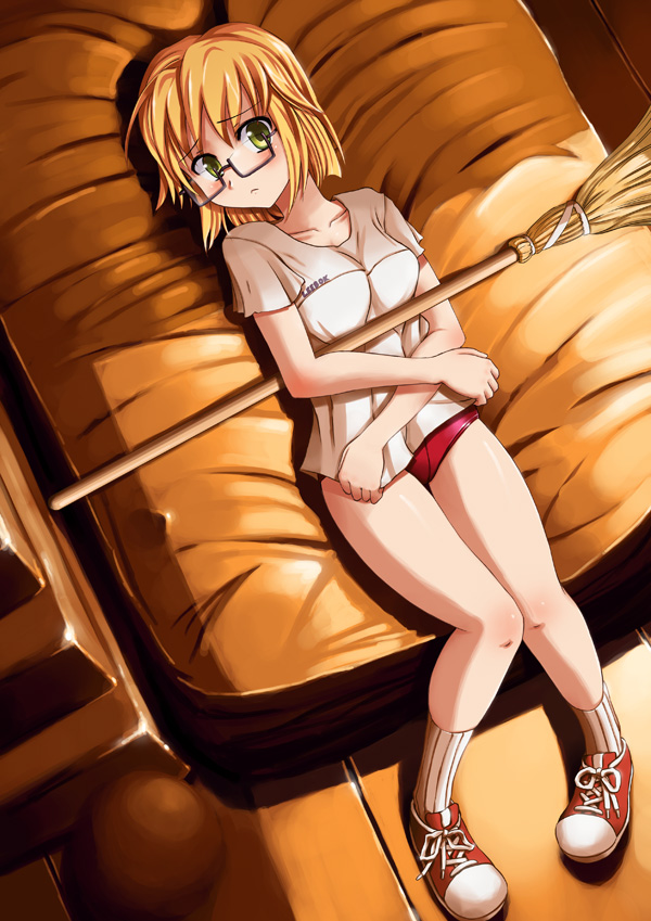 1girlbroomburumaclothes pullfemale focusglassesgym storeroomgym uniformknees together feet apartlegslyingon backorange hairshirt pullshoesshort hairsneakerssoloyellow eyes