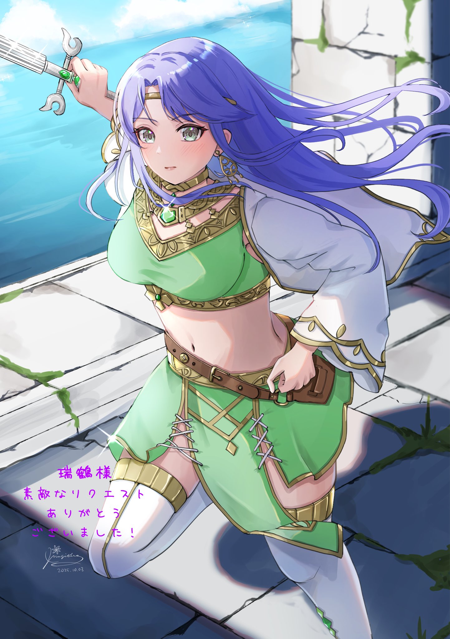 1girlblue hairbreastsclosed mouthcross-laced slitdatedgrey eyesholdingholding weaponhorizonlarge breastslooking at viewernaveloceansignaturesolothighhighsweaponwhite thighhighs