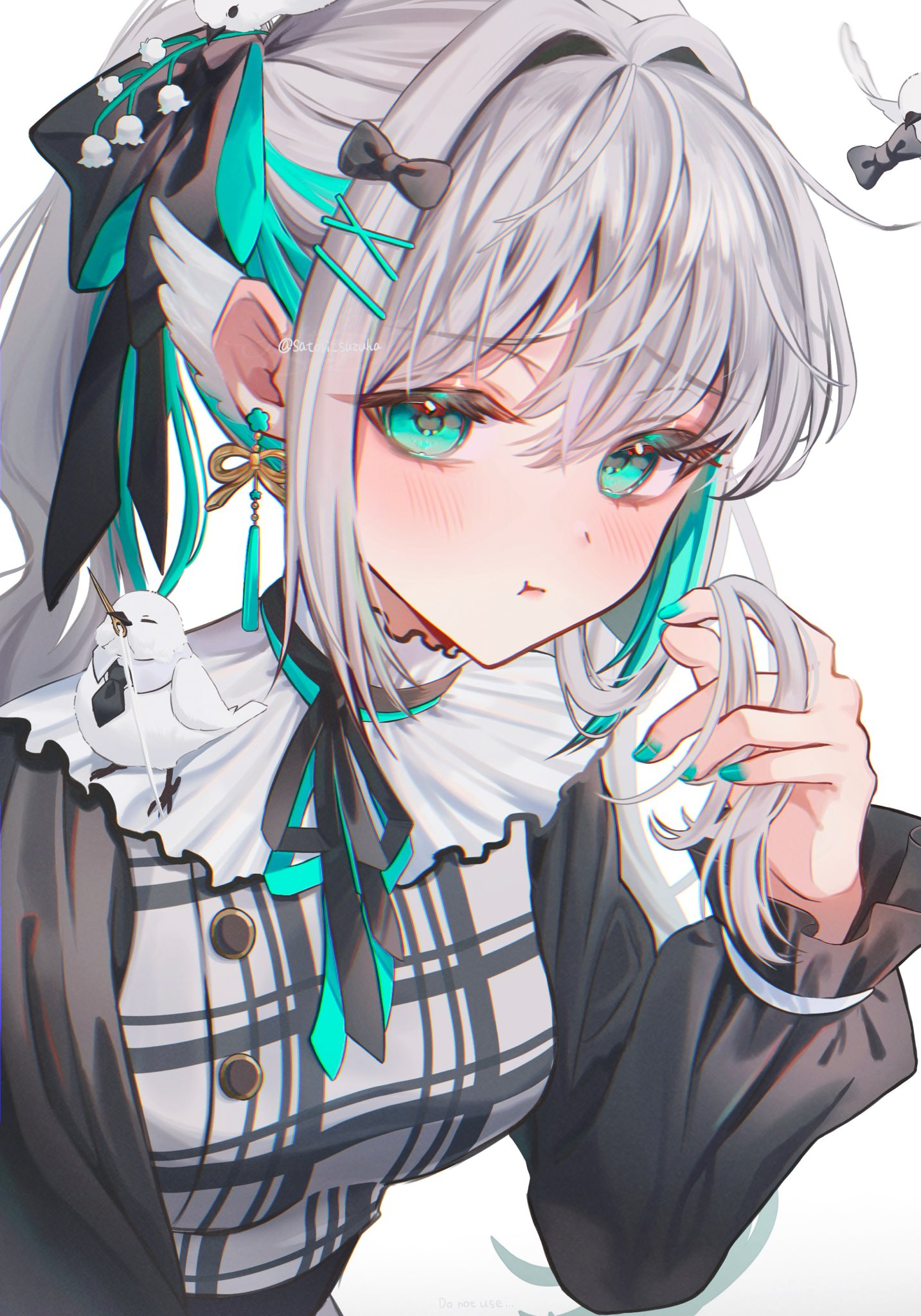 :t1girlblack bowblack dressblack ribbonblushbowbreastsclosed mouthdressearringsgreen eyesgreen hairgreen nailsgrey hairhair between eyeshair bowhair intakeshair ornamenthand upjewelrylong hairlong sleeveslooking at viewermedium breastsmulticolored hairnail polishneck ribbonribbonsimple backgroundsolostreaked hairtwintailstwo-tone hairupper bodywhite backgroundx hair ornament