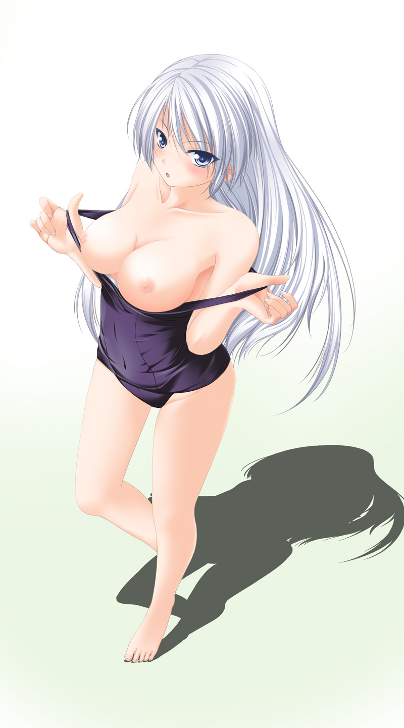 1girlbarefootblack one-piece swimsuitbreastsclothes pullfemale focuslarge breastslong hairnipplesone-piece swimsuitone-piece swimsuit pullpulling own clothesschool swimsuitshadowsoloswimsuitwhite hair