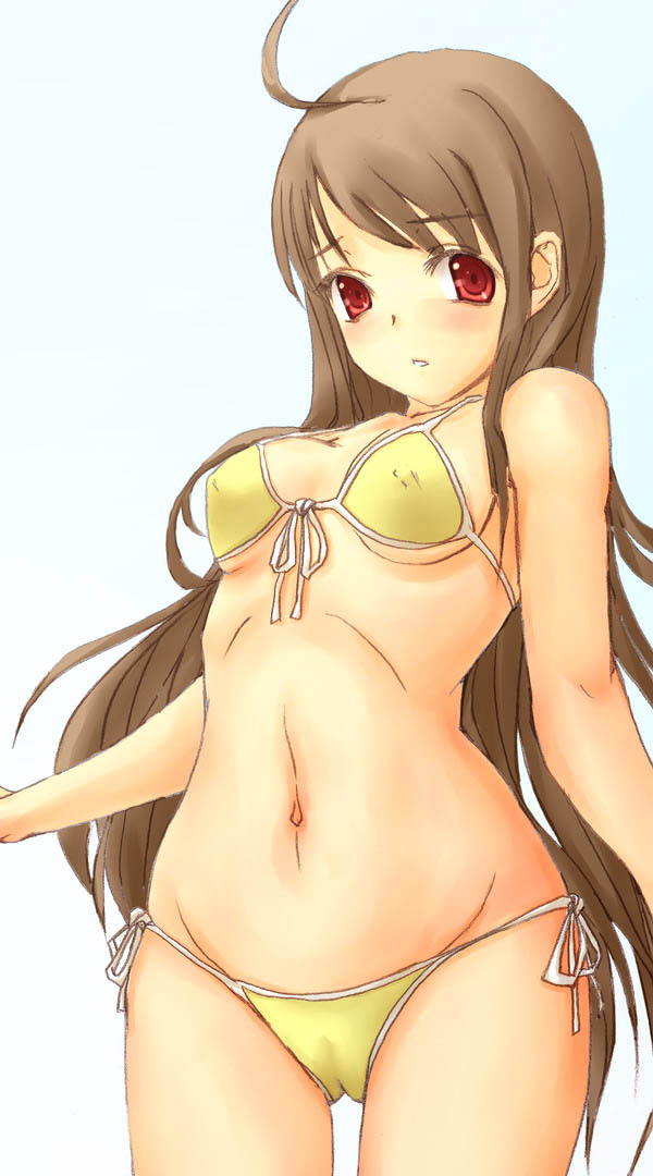 1girlahogebikiniblushbreastsbrown haircameltoecovered erect nipplesfemale focusfront-tie toplong hairlooking at viewernavelred eyesside-tie bikini bottomsimple backgroundsolostring bikiniswimsuitunderboobyellow bikini