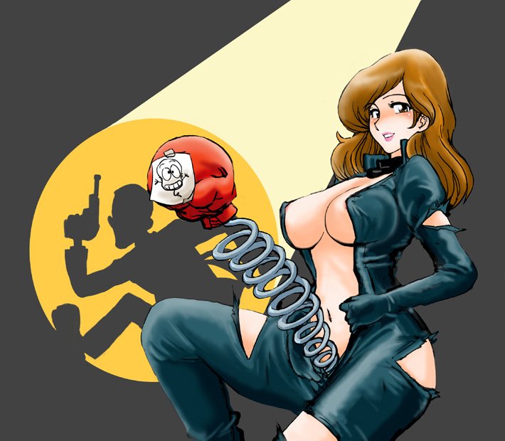 1girlblushbodysuitboxing glovesbreastsbrown hairfemale focusgunlarge breastslipsticklupin divemakeupno braopen bodysuitopen clothessexually suggestivesilhouettesmilesolotorn clothesunzippedweaponwhat