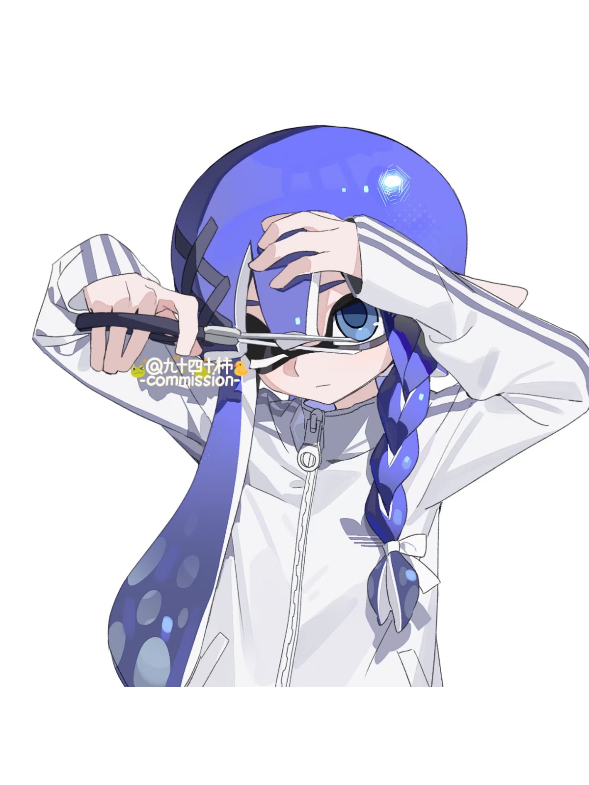 1girlblue eyesblue hairblue pupilsbraidholdingholding scissorsinklingjacketlong hairlow-tied long hairone eye closedpointy earsscissorssimple backgroundsingle braidsolostandingtentacle hairupper bodyvery long hairwhite backgroundwhite jacketzipperzipper pull tab