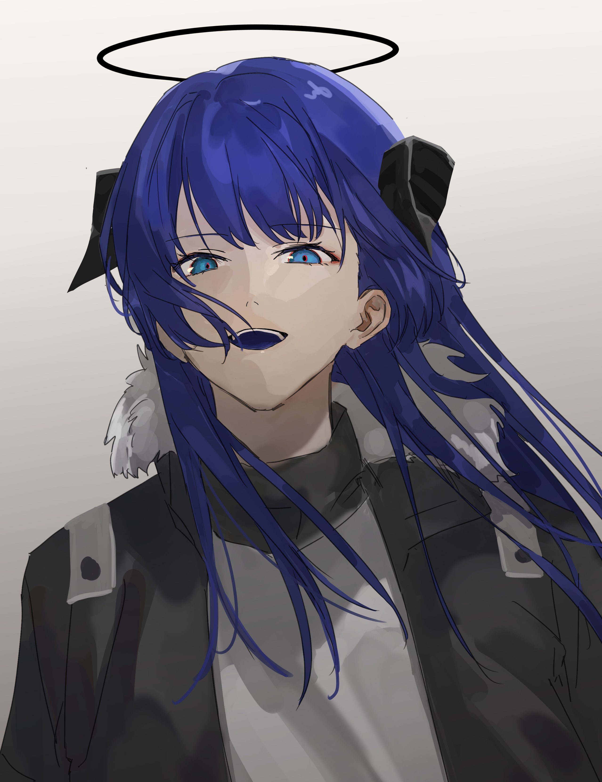 1girlblack jacketblue eyesblue hairblue tonguecolored tonguegrey backgroundhalojacketlong hairopen mouthshirtsoloupper bodywhite shirt