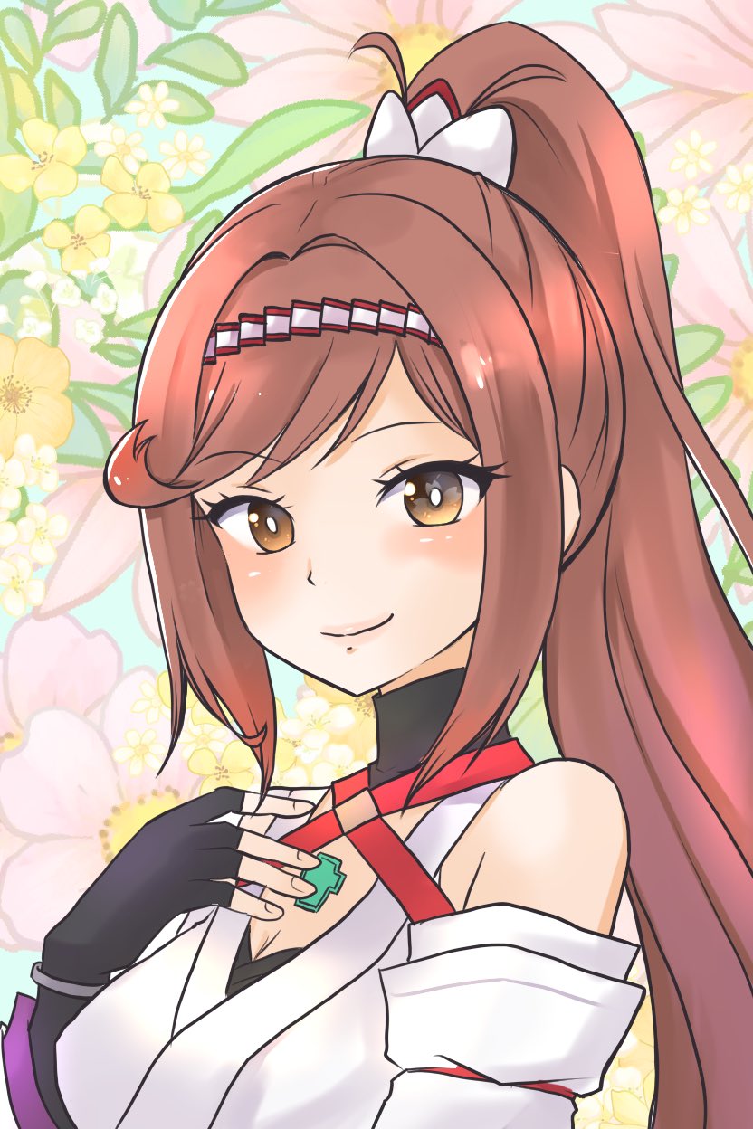 1girlbreastsbright pupilscleavageclosed moutheyelashesharusamenasusuhigh ponytaillarge breastsponytailred hairsidelockssmilesoloupper bodywhite pupilsyellow eyes