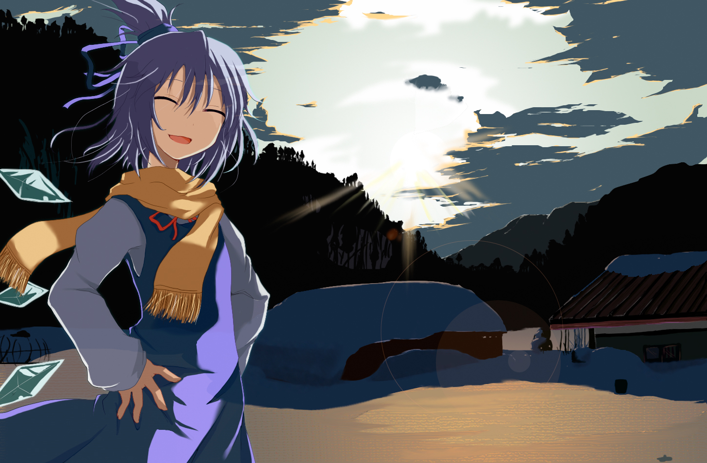 1girlalternate hairstyleblue hairbowcloudfemale focushands on own hipsnatureoutdoorsscarfskysmilesnowsolowings