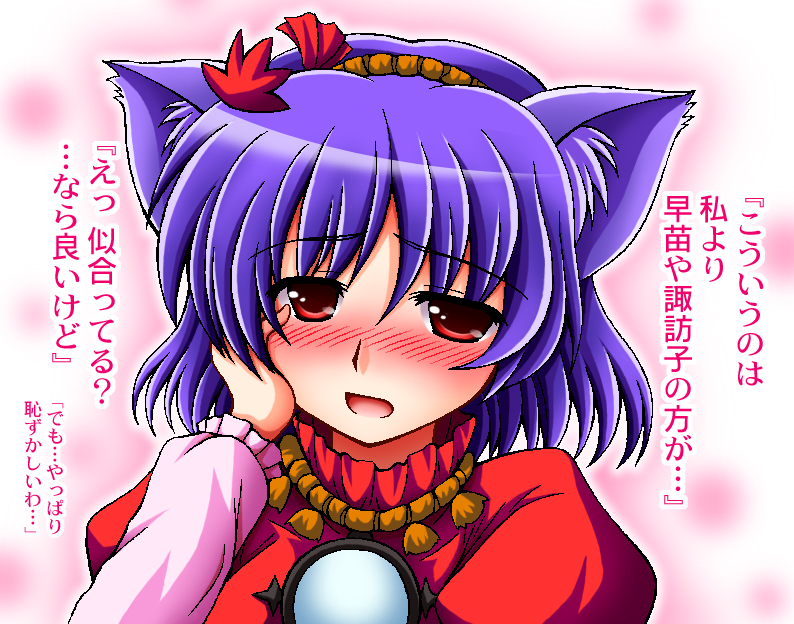 1girlanimal earsblushcat earscat girlfemale focushair ornamenthairbandhand on own cheekhand on own facekemonomimi modeleaf hair ornamentpurple hairred eyesshort hairsolo