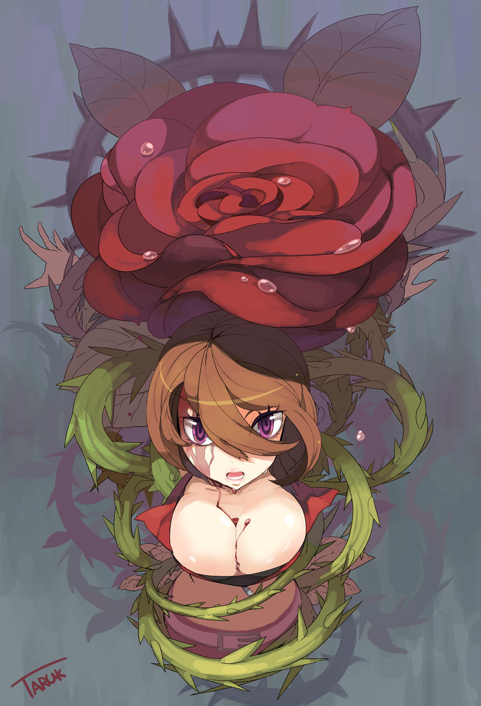 1girlbdsmbloodbondageboundbreastsbrown hairbust cupcleavagefemale focusflowerplantpurple eyesroseshort hairsolothornsvineszipper