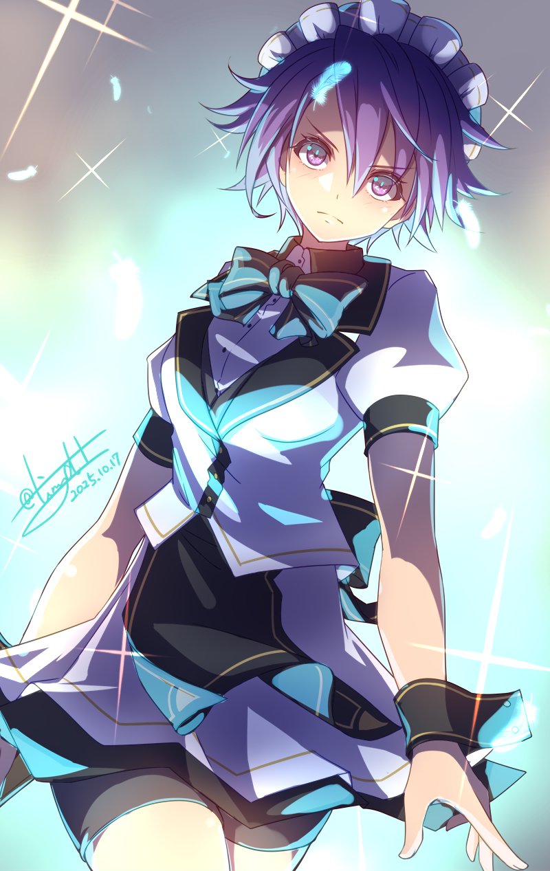 1girlblue bowblue bowtiebowbowtiebreastsclosed mouthclothes liftdatedhair between eyeslooking at viewermedium breastsparted bangspuffy short sleevespuffy sleevespurple eyespurple hairshort hairshort sleevesshortsshorts under skirtsignatureskirtskirt liftsolotraditional bowtietwitter usernameupper body
