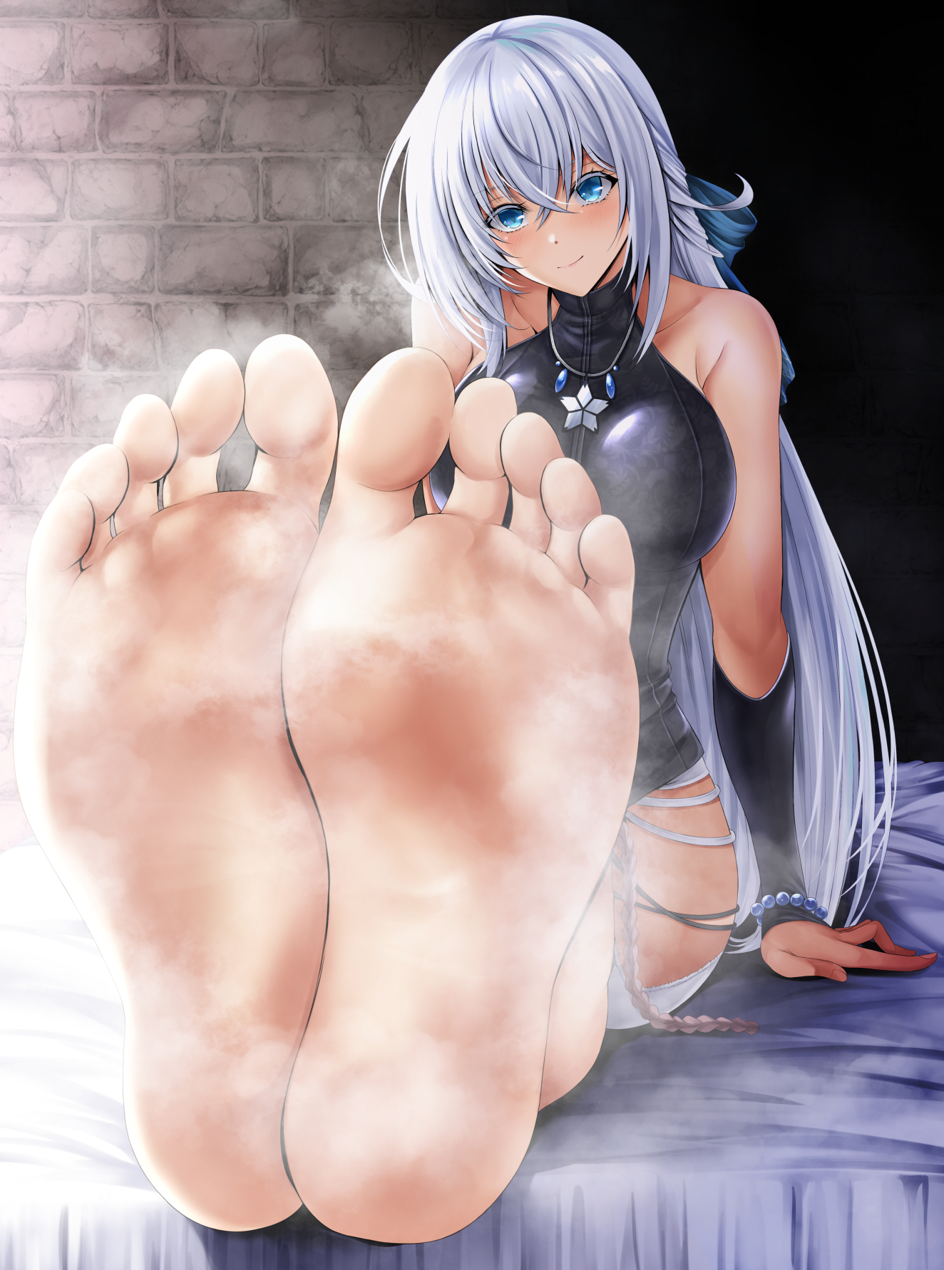 1girlbarefootbeadsbedblue eyesbob cutbreastsbridal gauntletsclosed mouthdouble-parted bangsfeetfoot focushair between eyeshalf updojewelrylarge breastslong hairlooking at viewernecklaceon bedprayer beadssittingsmilesolosteaming bodywhite hair