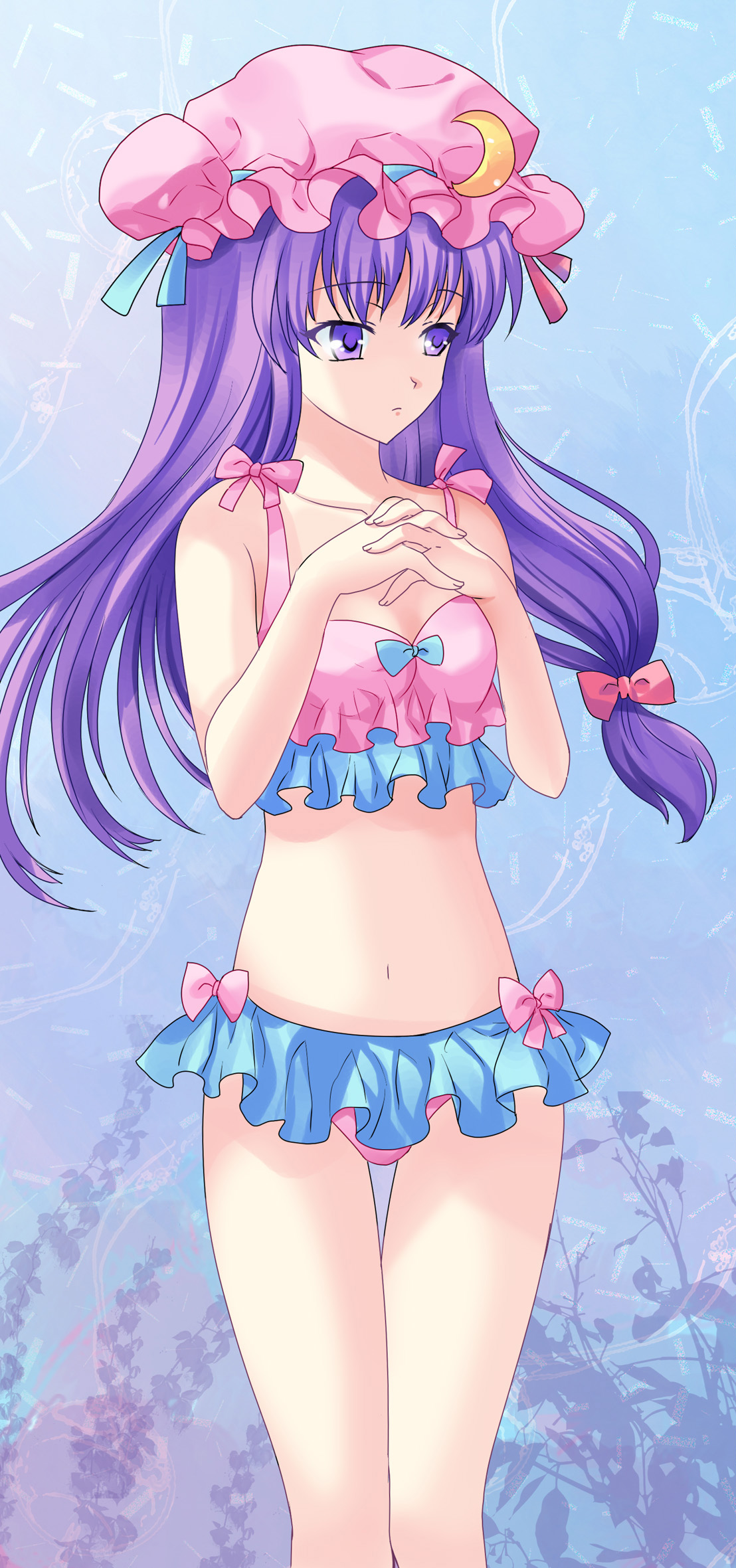 1girlbikinibowbraidcrescentcrescent hat ornamentfemale focushathat ornamentlong hairlow-tied long hairpink bowpurple eyespurple hairsoloswimsuit