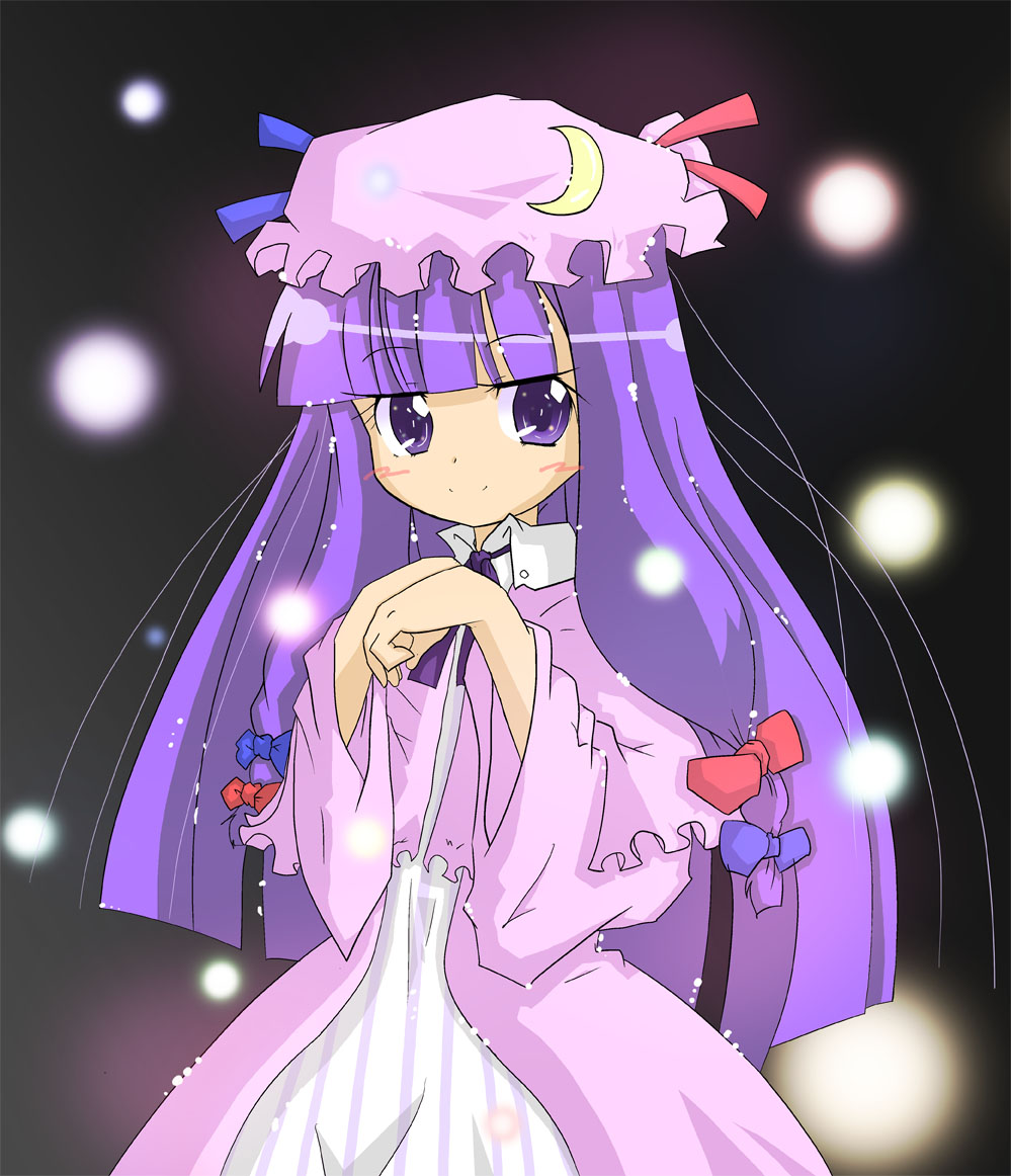 1girlblunt bangsbowbraidcrescentcrescent hat ornamentfemale focushathat ornamentlong hairpink bowpurple eyespurple hairsolo