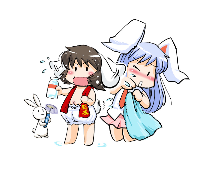2girlsanimal earsbarefootbloomersbrown hairchibifemale focuslong hairmultiple girlsnecktierabbitrabbit earsshort hairskirttowelunderwearwhite background