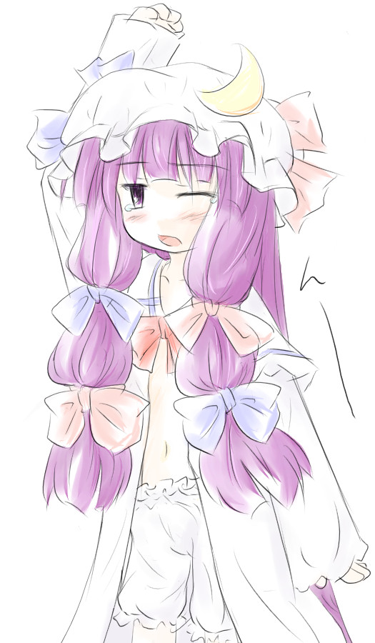 1girlcrescentcrescent hat ornamentfemale focushathat ornamentlong hairopen clothesopen shirtpurple eyespurple hairshirtsimple backgroundsolo