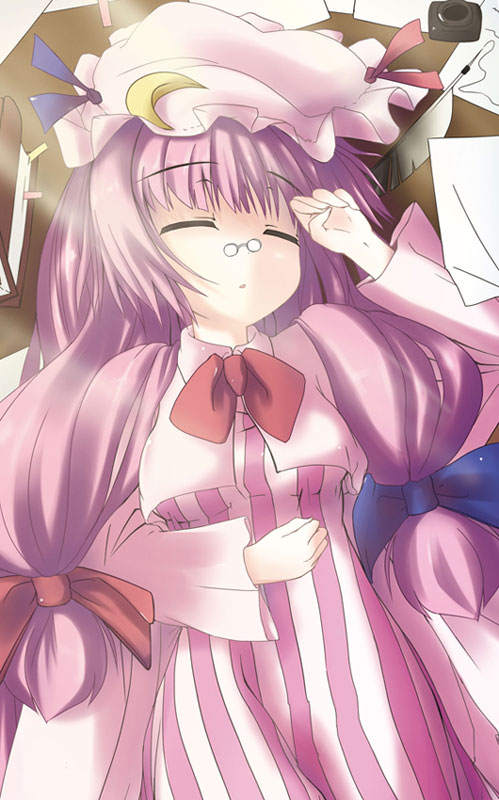 1girlbespectacledbookbraidclosed eyescrescentcrescent hat ornamentfeathersfemale focusglasseshathat ornamentinklong hairlow-tied long hairpurple hairsleepingsolo