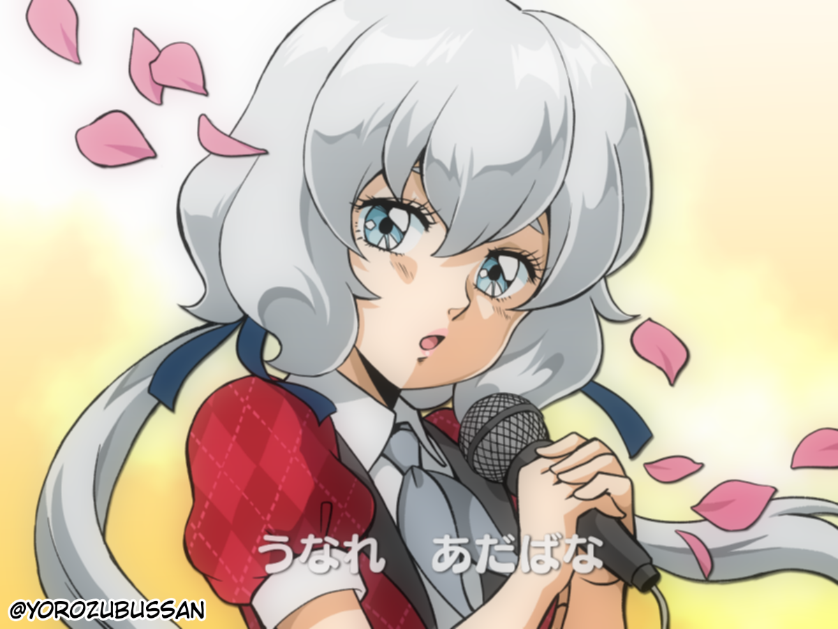 1girlargyle clothesargyle dressblue eyesblue ribbondresseyelashesfaux retro artstylegradient backgroundgrey hairhair between eyesholdingholding microphonelong hairmicrophoneneckerchiefoldschoolparted lipspetalspuffy sleevesred dressretro artstyleribbonshort sleevestwintailstwitter usernameyellow neckerchief