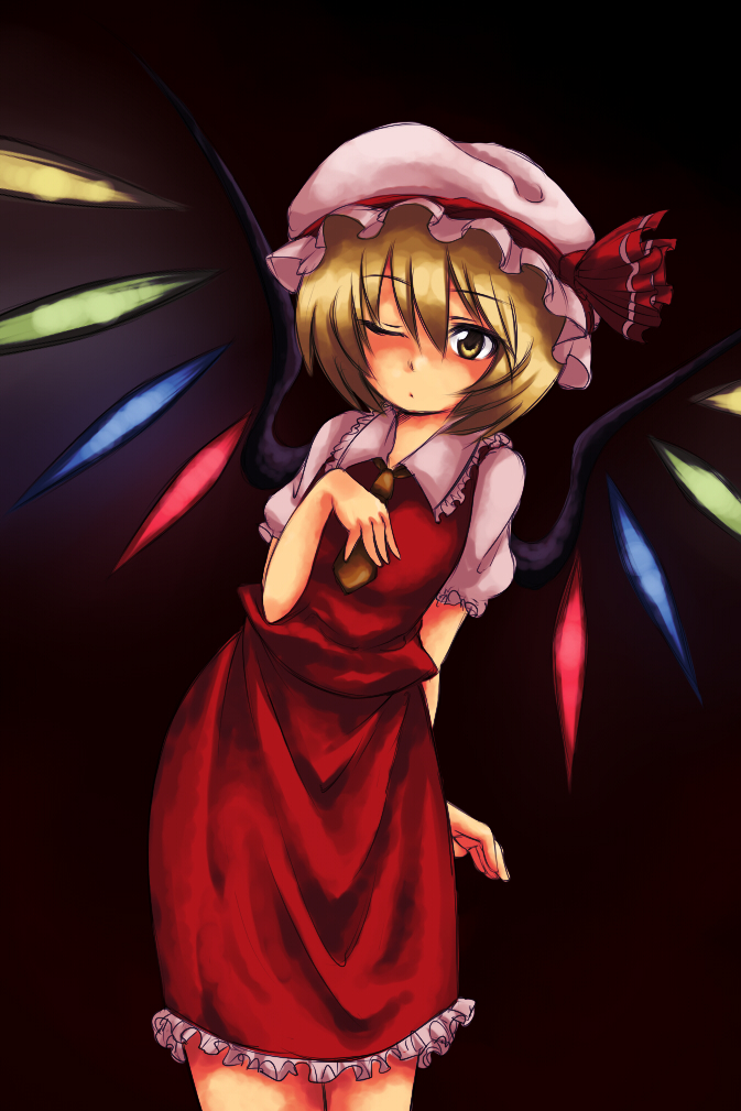 1girlblack backgroundblonde haircosplayfemale focusflandre scarlet (cosplay)hatmob capone eye closedsimple backgroundsolowingswink