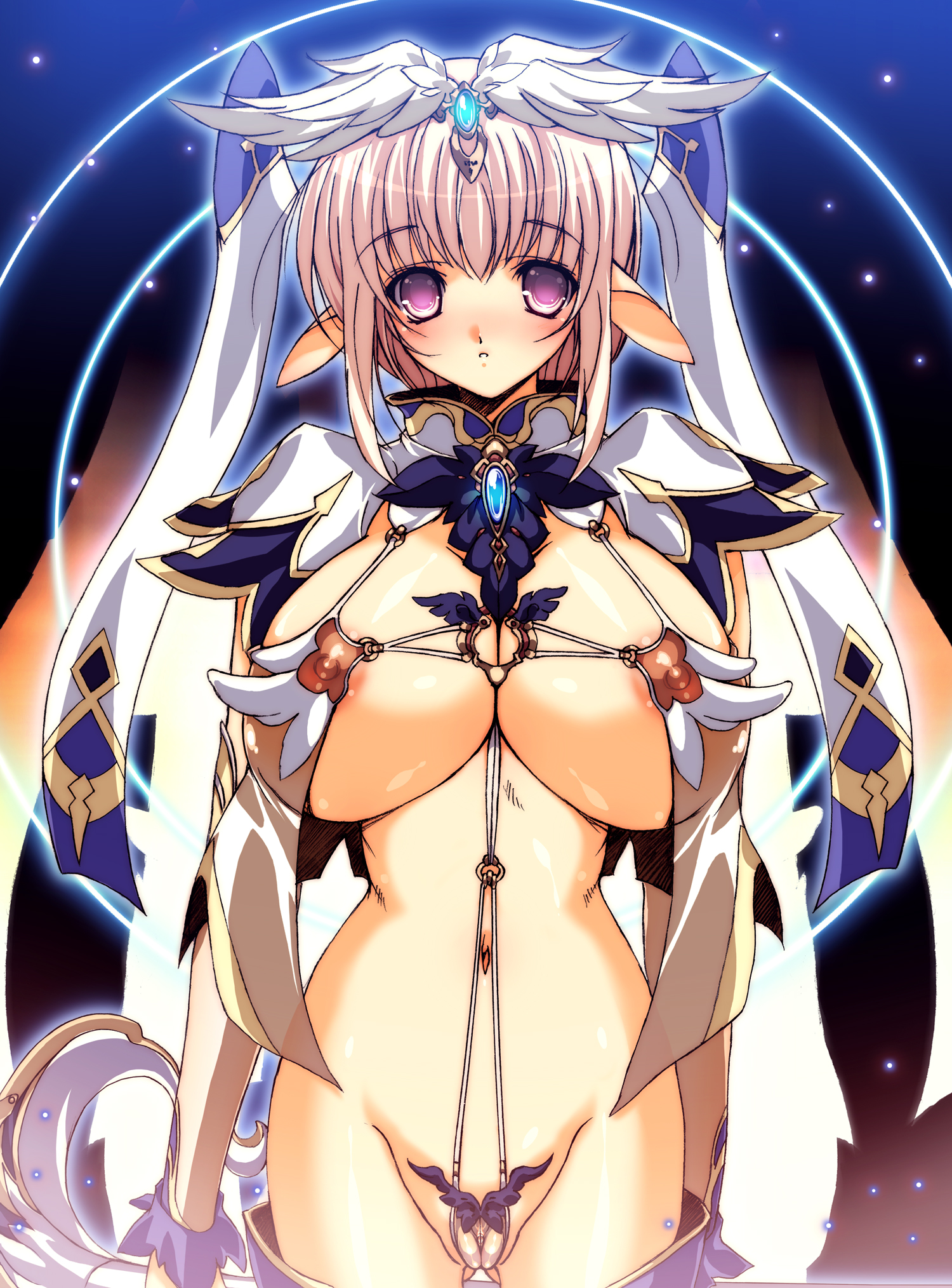1girlblonde hairblushbreastscameltoecrotchlesscrotchless leotardfemale focushead wingshuge breastsleotardnavelnipplespointy earsred eyesshort hairsolostandingwings
