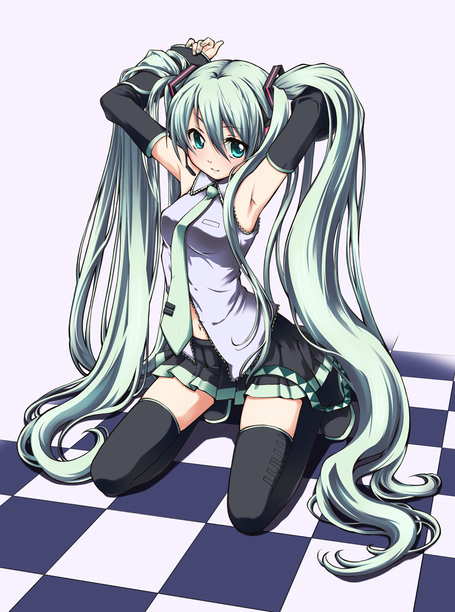1girlarmpitsarms upblack bootsblack skirtblack sleevesblue eyesblue hairblue necktiebootsbreastscheckered floorclosed mouthcollared shirtdetached sleevesfull bodygrey shirthair ornamentkneelinglong hairlooking at viewermedium breastsminiskirtmonochromenavelnecktieperspectivepleated skirtseizashirtsittingskirtsleevelesssleeveless shirtsmilesolothigh bootsthighhighstwintailsvery long hairzettai ryouiki