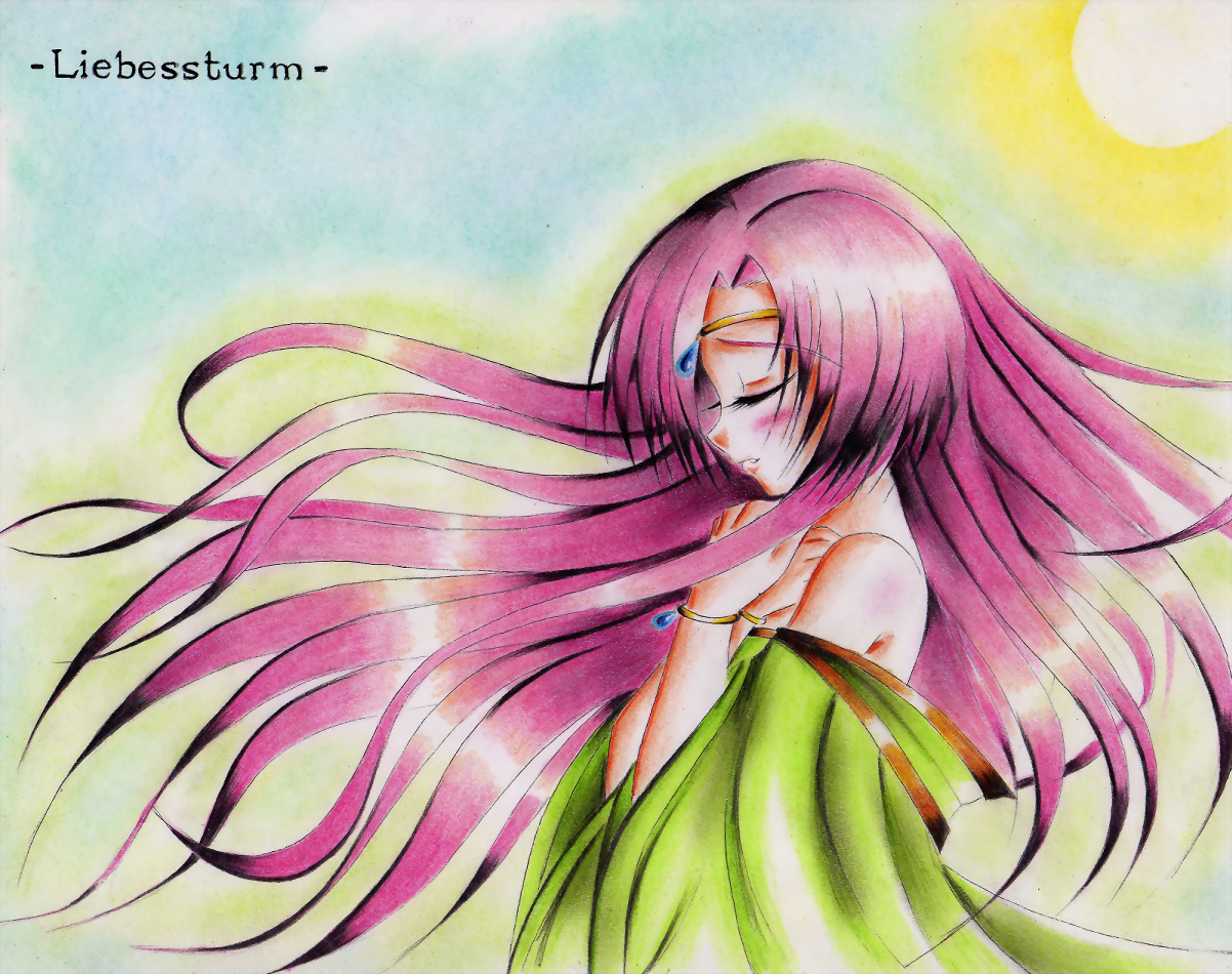 nikki (nikki), miracle nikki, nikki (series), absurdres, commentary, english commentary, highres, traditional media, 2019, 2girls, bare shoulders, bilingual text, blue eyes, blue nails, blue pupils, breasts, brown eyes, brown pupils, character name, china dress, chinese clothes, chinese hairpin, chinese text, cleavage, cleavage cutout, closed mouth, clothing cutout, collared dress, cowboy shot, dot nose, dress, eyelashes, eyes visible through hair, fingernails, happy, head on another's chest, height difference, high collar, high ponytail, holding hands, interlocked fingers, large breasts, light blush, lips, long hair, long sleeves, looking at viewer, loose hair strand, lunar (miracle nikki), mixed-language text, multiple girls, nail polish, off-shoulder sweater, off shoulder, open mouth, orange sweater, pink hair, ponytail, puffy long sleeves, puffy sleeves, purple hair, sidelocks, signature, sleeveless, sleeveless dress, sleeves past wrists, smile, standing, sweater, tareme, tsurime, very long hair, wavy hair, white arm warmers, winter miracle (miracle nikki), yamisaan