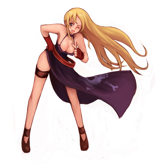 1girlblonde hairblue eyesbreastscleavagedressfemale focusfingerless glovesgloveslarge breastslong hairone eye closedpiratepointingsmilesolowindwink