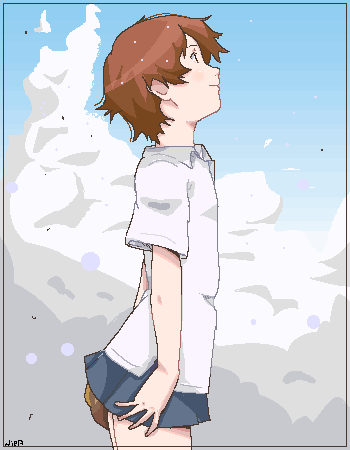 matoyama, lowres, 1girl, ass, blue background, blue eyes, blunt bangs, boots, brown hair, cheerleader, female focus, lips, long hair, oekaki, open mouth, pom pom (cheerleading), shorts, solo