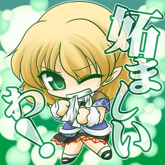 1girlblonde hairchibiclenched teethfemale focusfull bodygreen backgroundgreen eyesone eye closedpointy earssoloteethwink