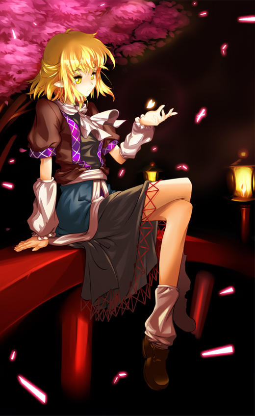 tooyama hirohito, holo, spice and wolf, bad id, bad pixiv id, 00s, 1girl, animal ears, apple, ass, brown hair, clothes lift, fang, female focus, food, fruit, holding, holding food, holding fruit, long hair, no panties, pixiv bottlecap, red eyes, skirt, skirt lift, solo, tail, wolf ears, wolf tail