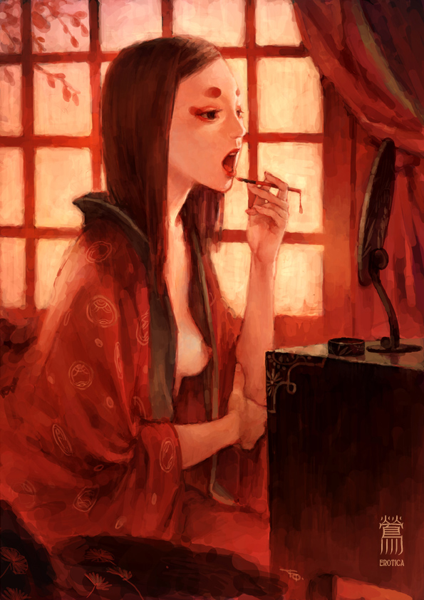 1girlapplying makeupapplying own makeupbreastsbrown haircabinetcurtainseyeshadowfemale focusgeishajapanese clotheskimonolipstickmakeupmirrornipplesoiranopen clothesopen robered themerobeshort hairsolotreewindow