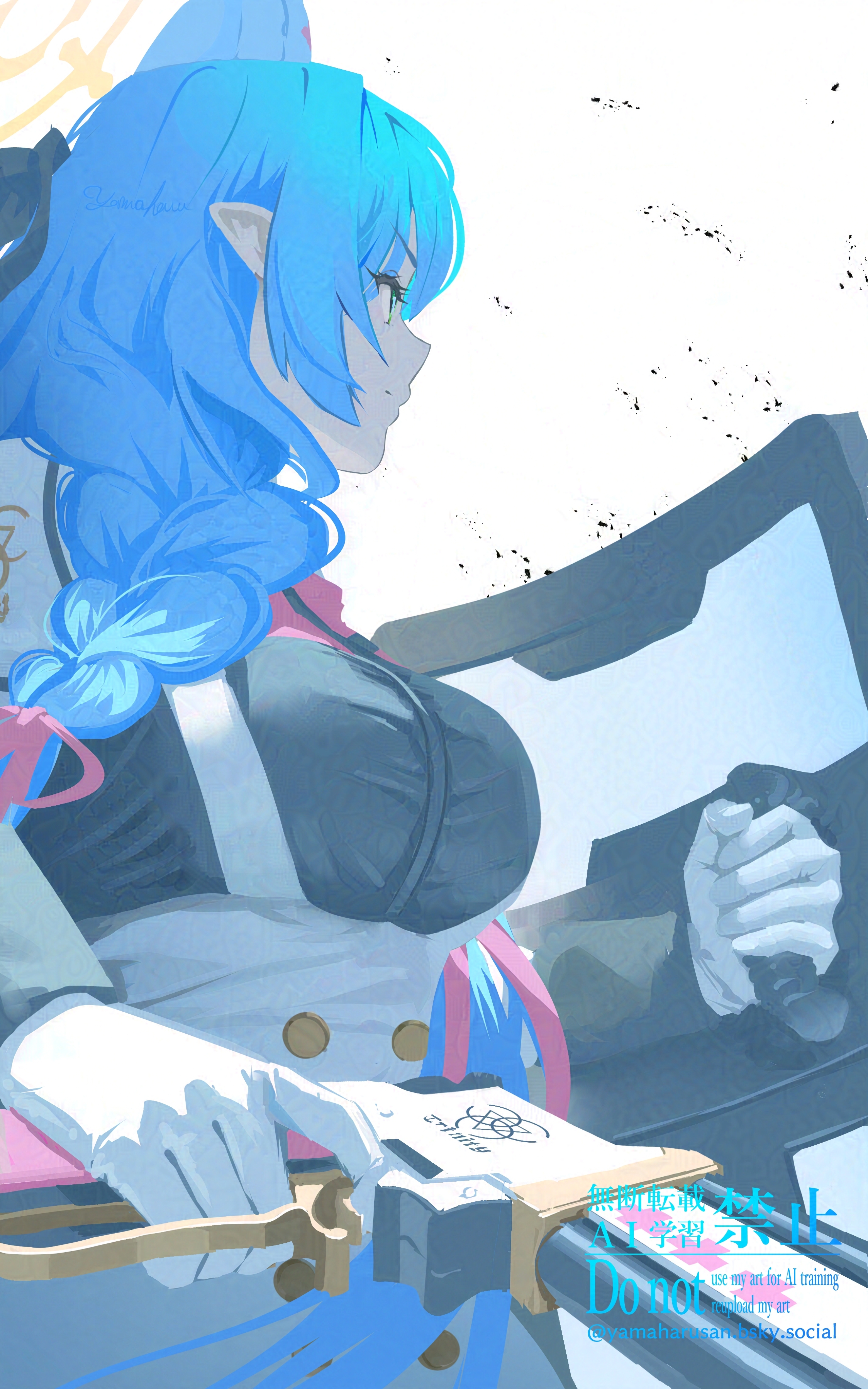 1girlblack shirtblue hairbraidclosed mouthglovesgreen eyesgunhalohatholdingholding gunholding shieldholding weaponlever actionlong hairnurse capshieldshirtsidelocksskirtsmilesolotwin braidsweaponwhite gloveswhite hatwhite skirtyellow halo