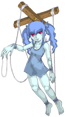 d omm, ashley (warioware), red (warioware), nintendo, warioware, warioware: move it!, 1boy, 1girl, beach, big hair, black hair, demon, dress, hairband, long hair, looking at viewer, orange hairband, red dress, red eyes, skull, skull brooch, skull ornament, solo, twintails, very long hair, yellow brooch