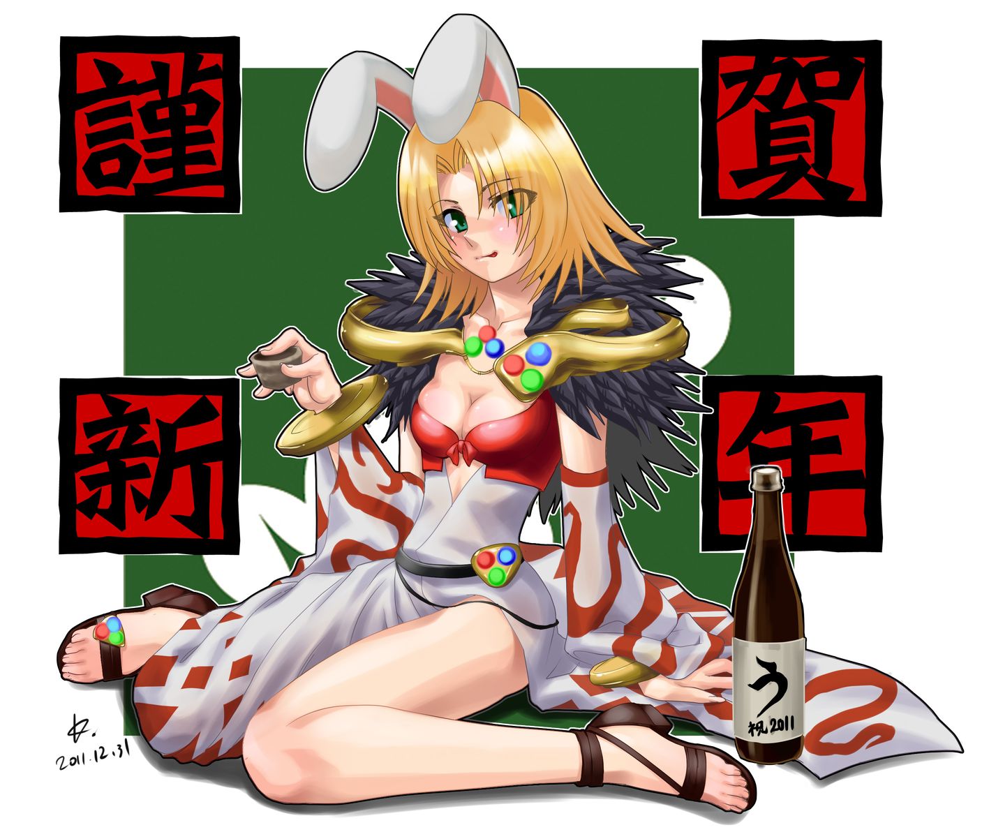 1girl2011animal earsbeltblack beltblonde hairblushbreastsbrown sandalschinese zodiaccleavageclosed mouthcurtained hairdateddetached sleevesdressfull bodyfur collargreen eyeslooking at viewermedium breastsodyssanrabbit earssandalsshort hairsittingsmilesolowarizawhite dresswhite sleevesyear of the rabbit